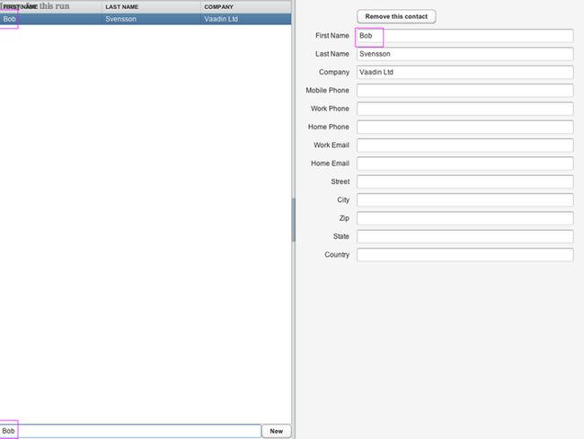 The example contains only one test found in the src/test/java/com/vaadin/tutorial/addressbook/NewEntryIT.java file. The test adds a new entry in the address book and verifies that it is found when searching. The test was developed using the Firefox driver and, once finished, switched to the PhantomJS driver. I recommend you use a browser like Firefox or Chrome while developing your tests, as it can be very useful to see what actually happens while you are fine tuning your tests.