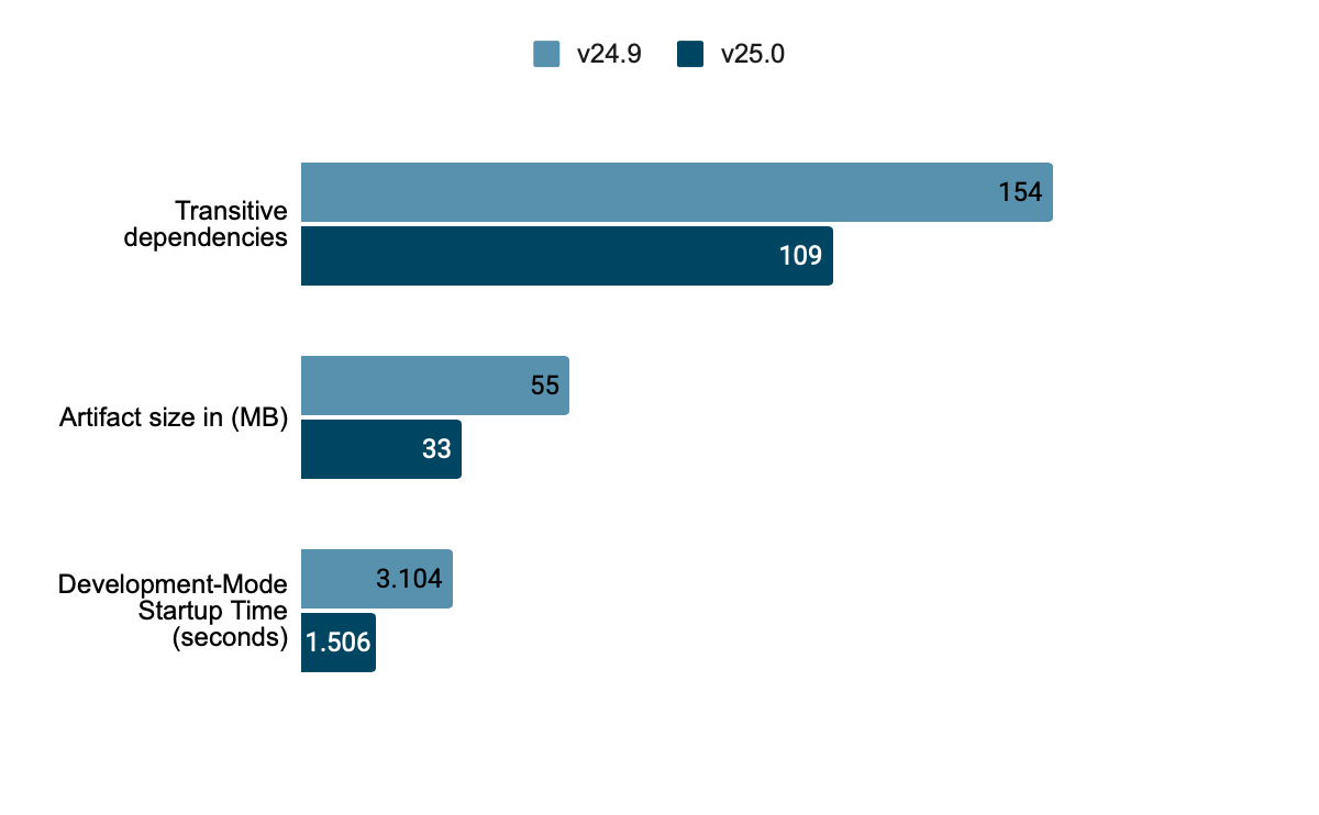 I ran a few tests using a basic Spring Boot–based Vaadin application, built with 25.0.0-beta9 and Spring Boot 4.0.0 (vs 24.9.6 and 3.5.6). I inspected artifact size, embedded dependencies, deployment time and development server startup time. Even though I had my hands dirty helping in the cleanup process, I was still positively surprised by the numbers.