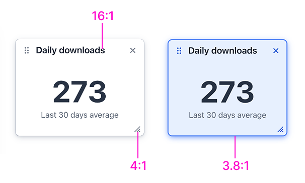 The widget’s border when neither focused nor selected has a contrast ratio of 1.3:1 against a white background, which falls far below the 3:1 requirement for graphical elements, but as the widget itself is not interactive, and its title provides a sufficient visual indication of its location, contrast requirements do not apply to it. It is, however, easy to increase the border’s contrast by configuring the border color globally through the --vaadin-dashboard-widget-border-color CSS property.