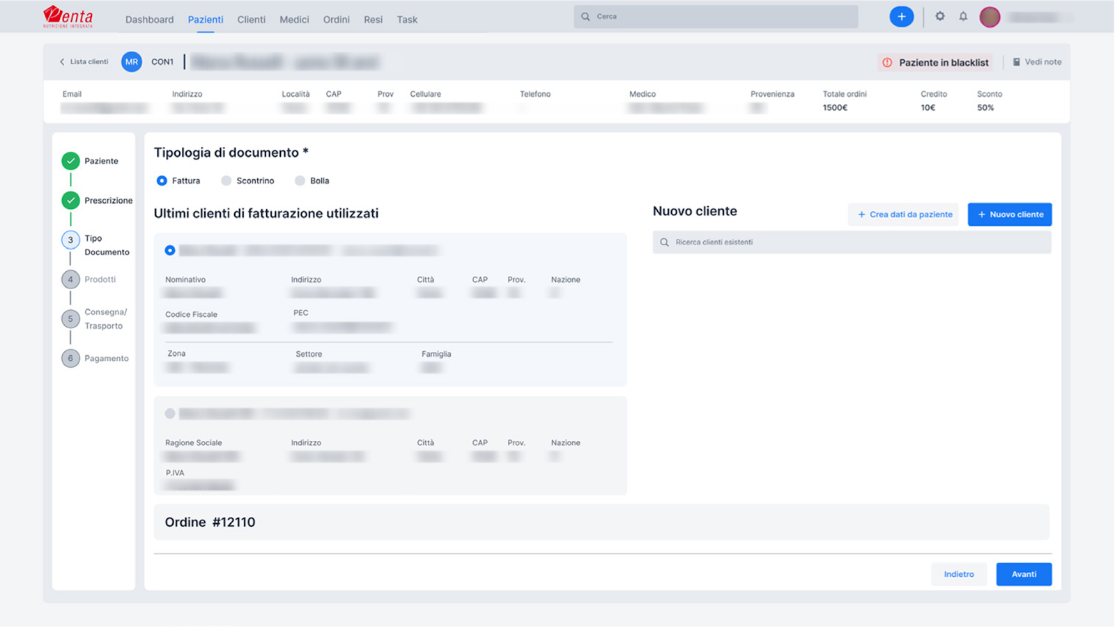 Order creation step in New Penta’s AOM system showing billing document selection, customer details, and workflow progress.