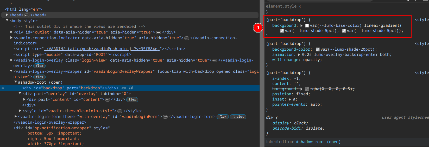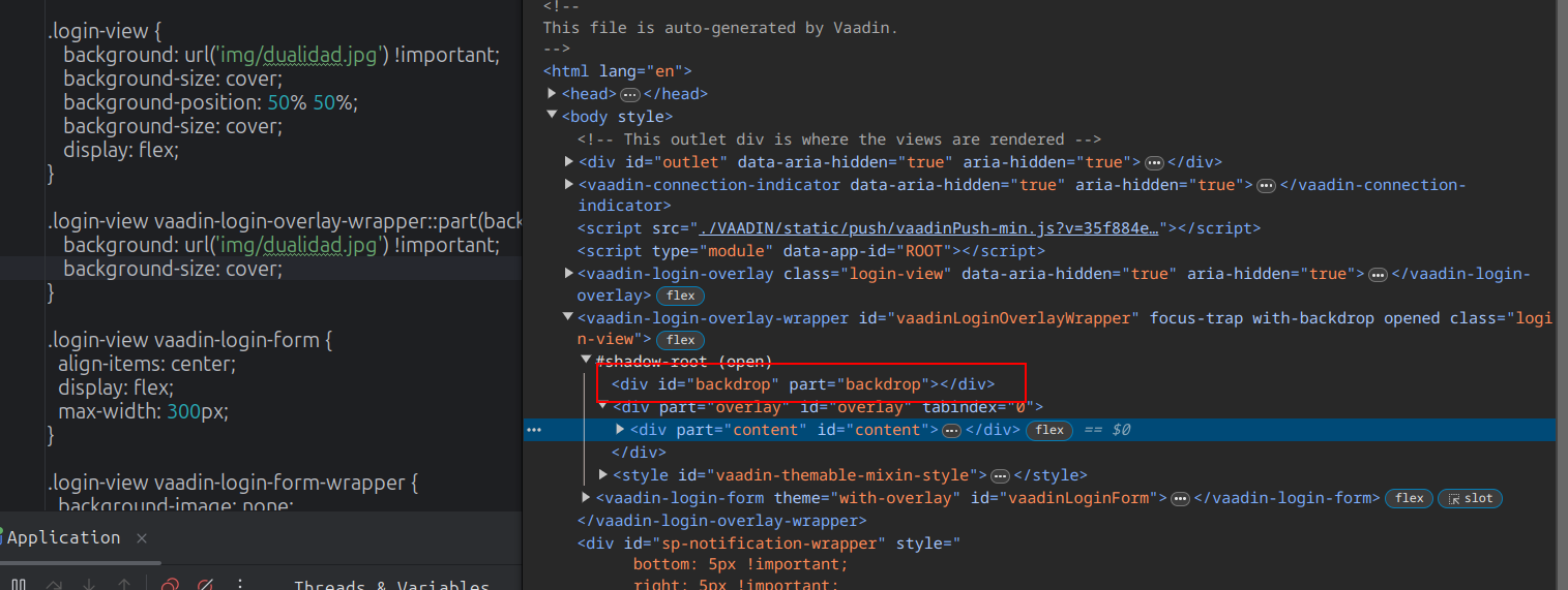 As you see in the dom inspector vaadin-login-overlay-wrapper is not a child of “.login-view”, thus selector “.login-view vaadin-login-overlay-wrapper” does evaluate to nothing.