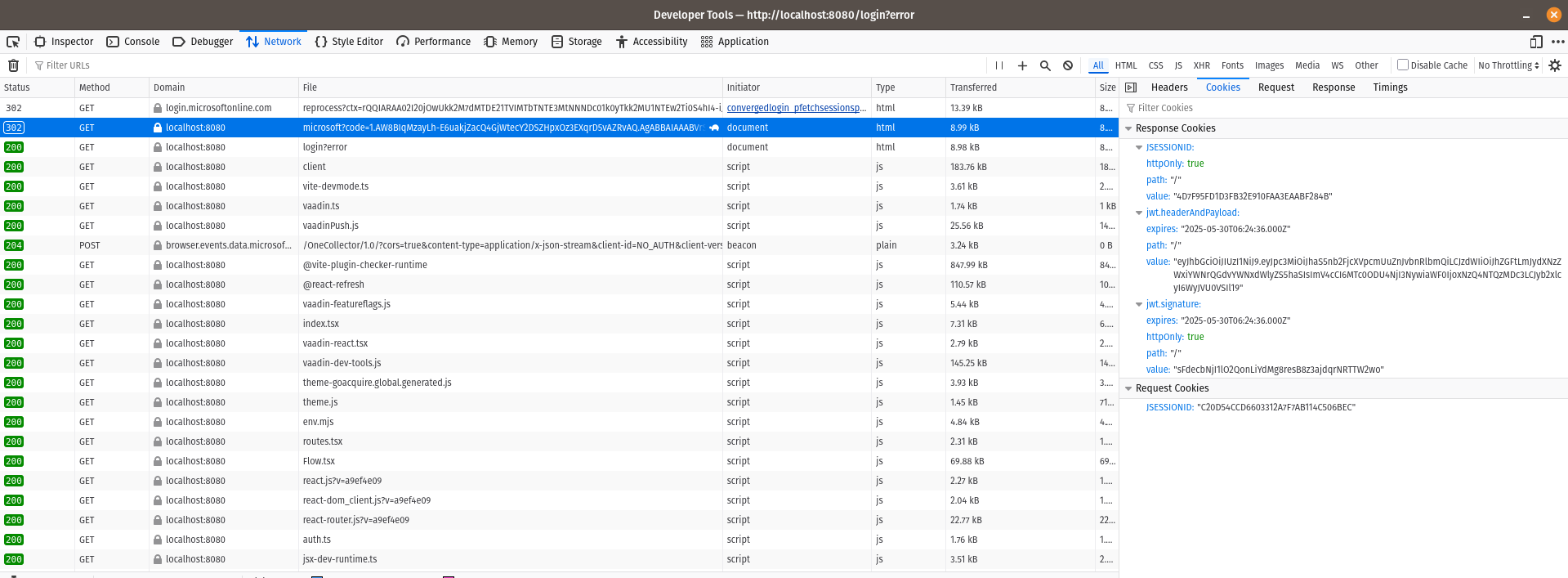 This screenshot shows the response cookies after my oauth return request even with the auth failure: