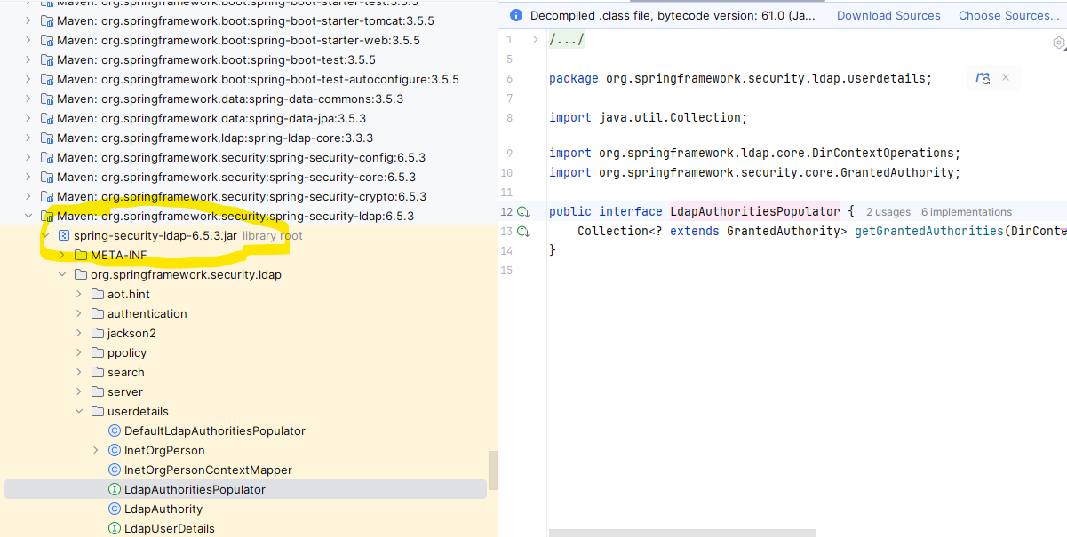 But neither Intelij nor maven can detect the LdapAuthoritiesPopulator and I get the error: