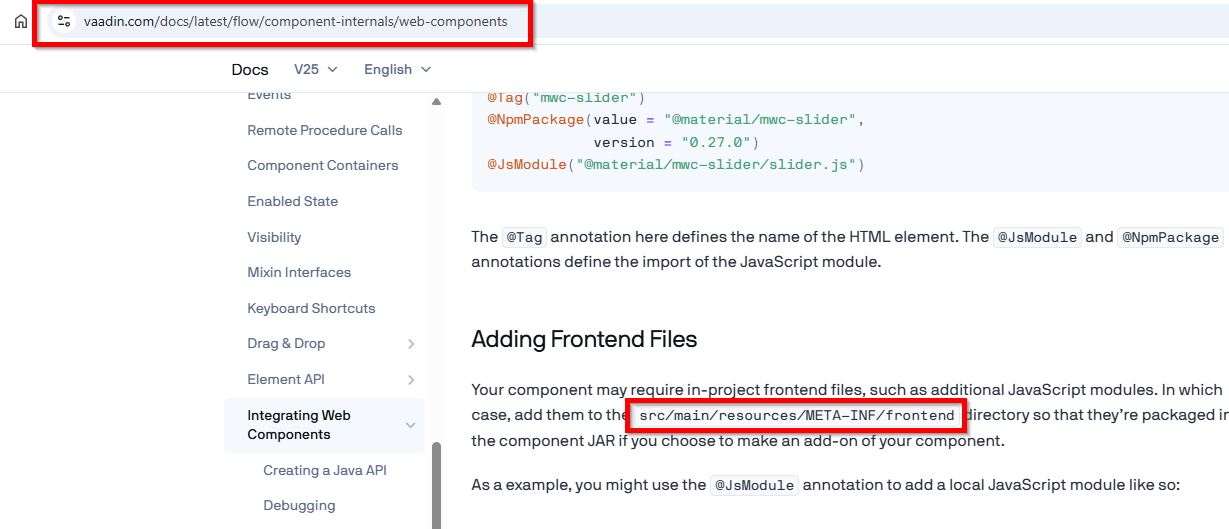 I’m trying to create a custom component and following this page How to package a Vaadin component as a reusable add-on. The information given here and here How to use web components in Vaadin are not in SYNC as per my understanding. In V25, the path has been changed and so the new path is src/main/resources/META-INF/resources/frontend/ but this page says differently