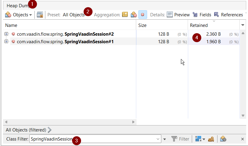 I investigated a little bit in order to understand the foodprint. Am i right, that i have correctly found the values in VisualVM, which are most important to track sessions sizes?